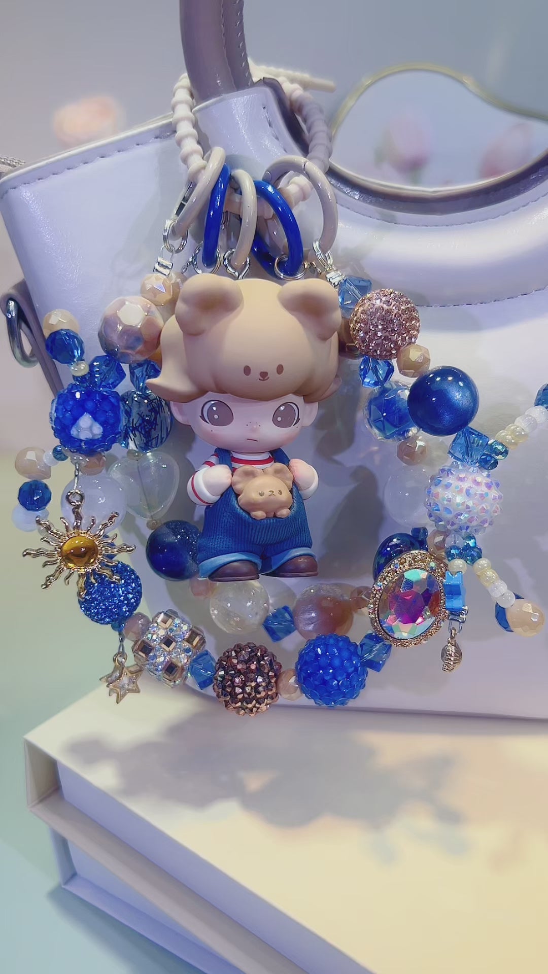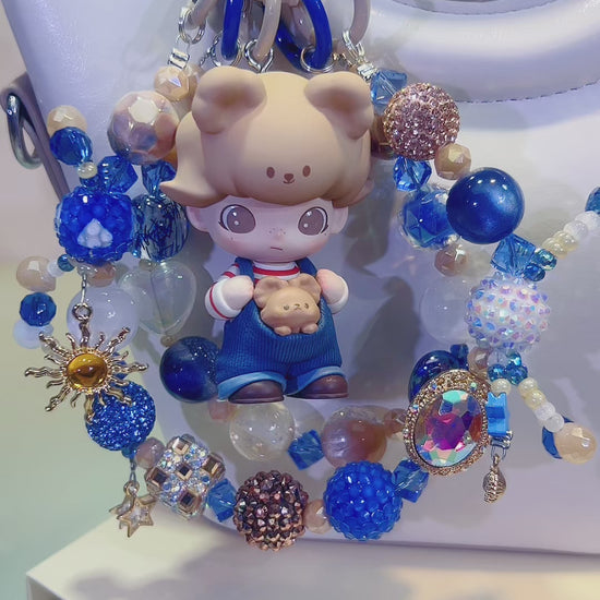 Feel the warm charm of Dimoo Bear Dad! This cute Dimoo, dressed as a gentle bear dad with a tiny bear in his arms, radiates a cozy, familial warmth. Surrounded by a handmade bead chain full of shiny blue beads, sparkling accents, and cute pendants, every detail oozes a sense of loving, daddy - bear cuteness.