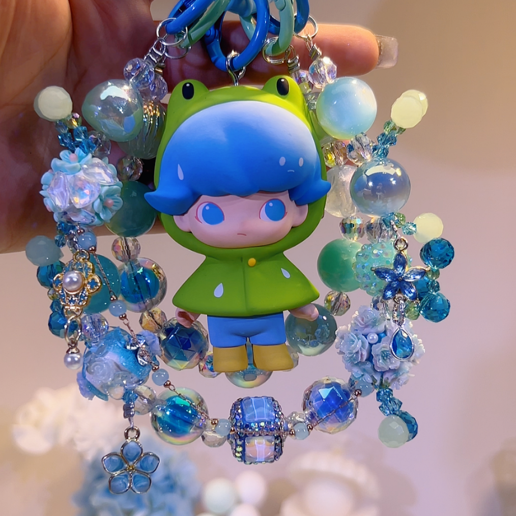 Surrounding Dimoo is a meticulously hand - crafted bead chain, a harmonious blend of various shades of blue, green, and iridescent tones. Shimmering crystal - like beads mimic the glistening of dewdrops on leaves or the sparkle of sunlight on a garden pond. Textured beads add depth and a tactile dimension, evoking the feel of soft grass or the smooth surface of a garden pebble.