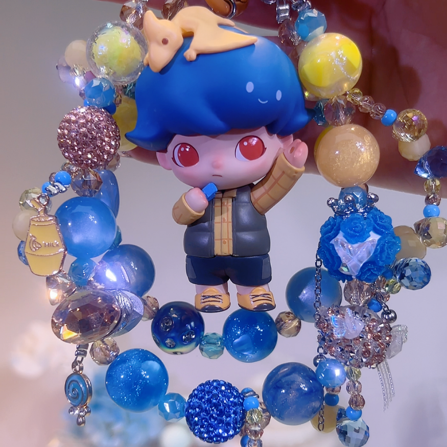 Surrounding Dimoo is a meticulously crafted bead chain, featuring a harmonious mix of blue, yellow, and iridescent tones. Shimmering crystal - like beads mimic the glistening of sunlight on ancient fossils or the sparkle of mysterious prehistoric gems. Textured beads add depth and a tactile dimension, evoking the feel of rough dinosaur skin or the smooth surface of a polished fossil.