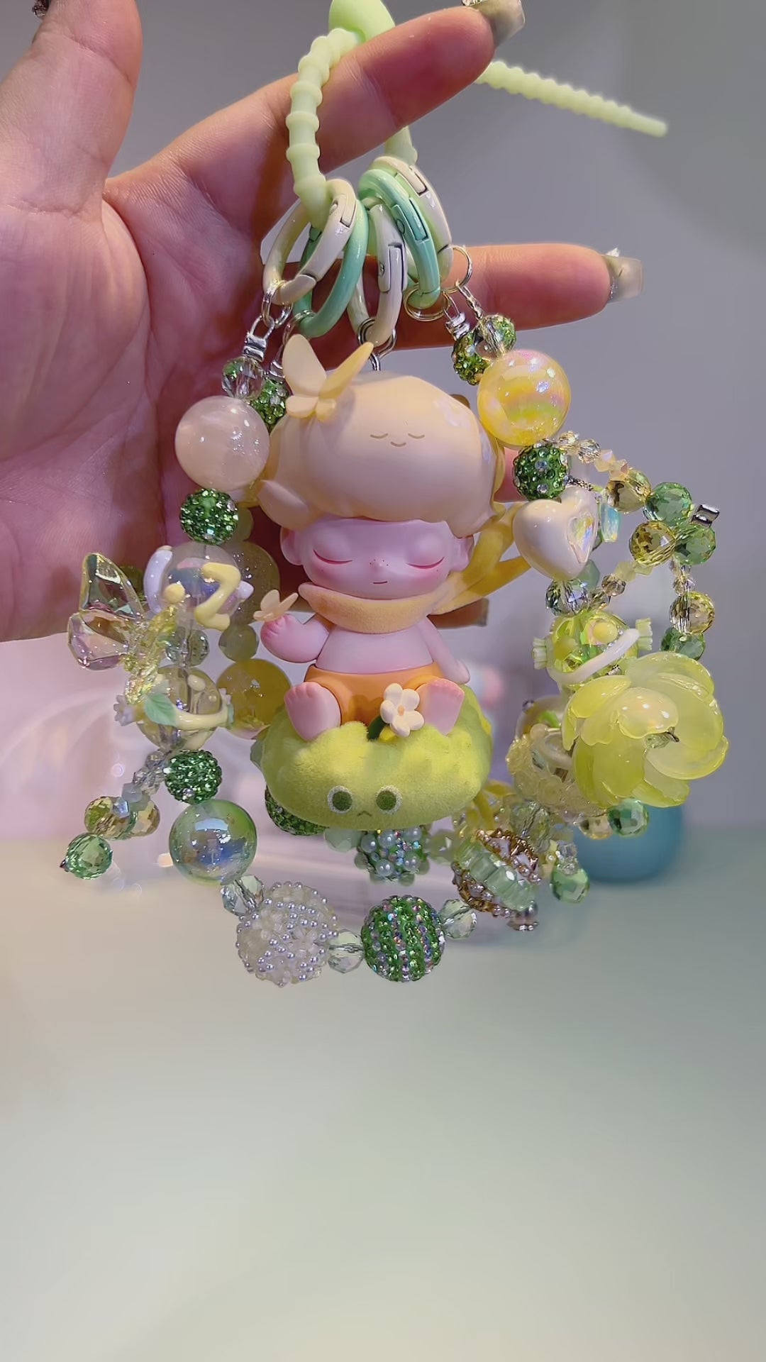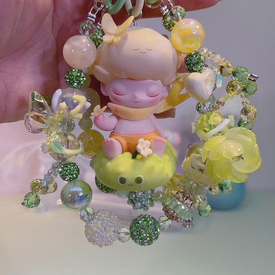 Step into a fresh, green dream with Dimoo Pleasure! This adorable Dimoo, nestled on a cute green cushion with a sunny, relaxed vibe, is surrounded by a handmade bead chain full of shiny, iridescent beads in green and yellow tones, plus charming pendants. Every detail blends to create a vibe of peaceful cuteness, like a little moment of relaxation in a fairy - tale garden.