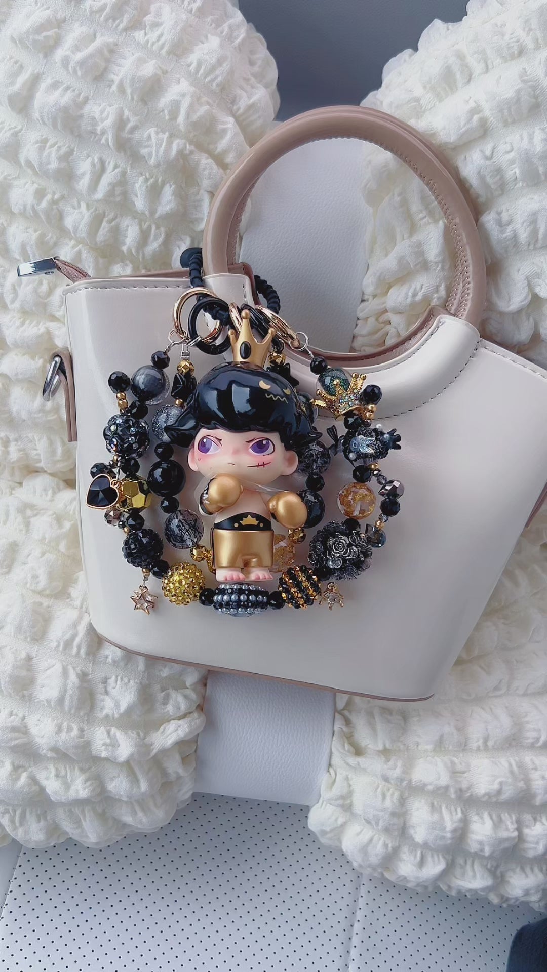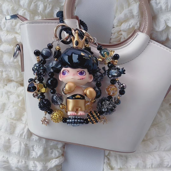 Elevate your ride with a dose of bold, rebellious charm! This Dimoo “Rocky Overlord” car charm is a total show - stopper. The iconic Dimoo figure, rocking that edgy “Rocky Overlord” look — complete with a tiny crown, cool hairstyle, and boxing - inspired outfit — is surrounded by a circle of sleek black beads, shimmering gold crystals, and attitude - packed pendants. From the star - shaped accents to the heart - and - rose bling, every detail screams “royal swagger with a streetwise edge”.