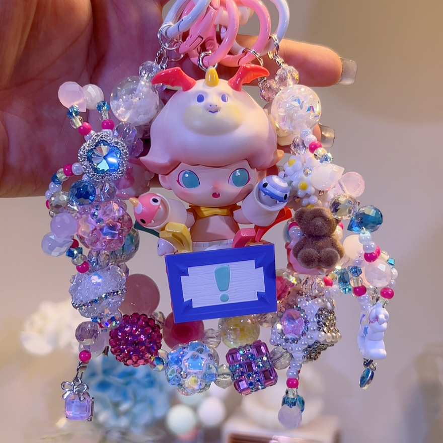Surrounding Dimoo is a meticulously hand - crafted bead chain, a harmonious blend of various shades of pink, blue, white, and iridescent tones. Shimmering crystal - like beads mimic the glistening of surprise - filled moments or the sparkle of hidden treasures. Textured beads add depth and a tactile dimension, evoking the feel of soft plush toys or the smooth surface of a mysterious box.