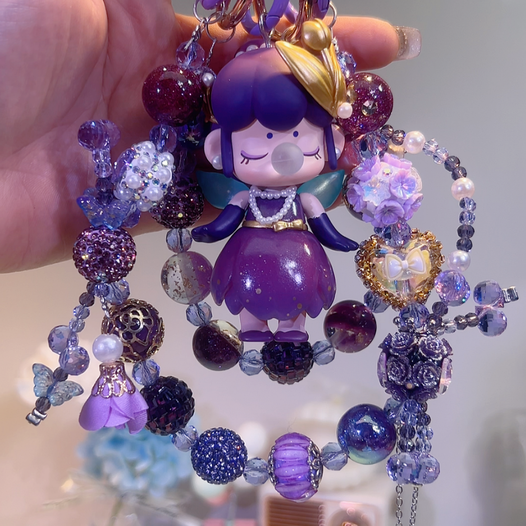 At the heart of this beaded charm is the Nanci figure. Nanci has dark purple hair adorned with a golden, petal - like decoration, reminiscent of a tulip's bloom. Her eyes are gently closed, and a bubble rests on her lips, giving her a peaceful and dreamy expression, as if she's lost in the beauty of the tulips.