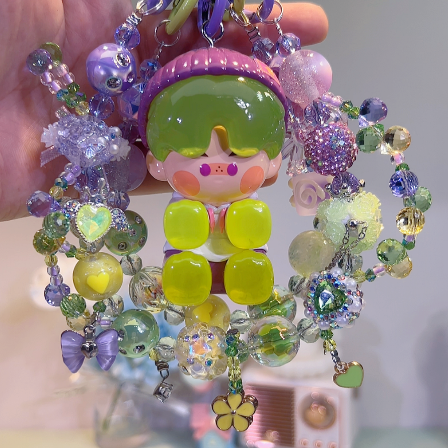 Surrounding Pinojelly is a meticulously hand - crafted bead chain, a vibrant blend of purple, green, yellow, and iridescent tones. Shimmering crystal - like beads mimic the glint of pixels on a Game Boy screen or the sparkle of in - game power - ups, while textured beads add depth and a tactile dimension, evoking the feel of a well - loved game cartridge or a smooth controller.