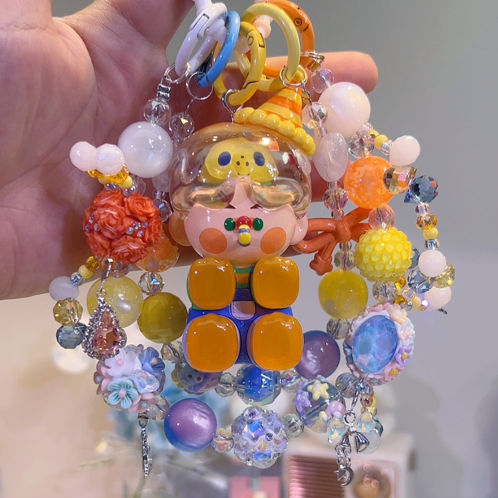 Surrounding Pinojelly is a meticulously hand - crafted bead chain, a vibrant mix of yellow, orange, blue, purple, and iridescent tones. Shimmering crystal - like beads catch the light, creating a dazzling and cheerful sparkle, much like the energy of a playful child. Textured beads add depth and a tactile dimension, with some resembling the look of shiny candies or colorful decorations.