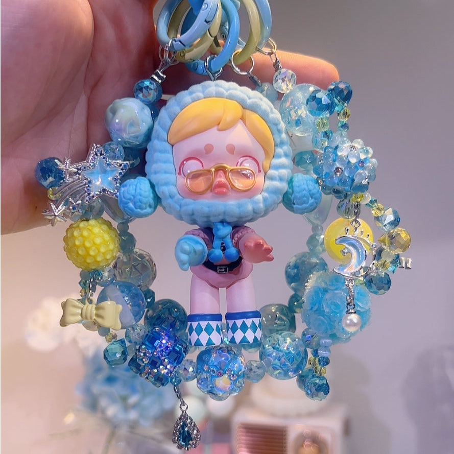 Surrounding Skullpanda is a meticulously hand - crafted bead chain, a harmonious blend of various shades of blue, from soft pastels to deeper tones, along with touches of yellow and iridescent hues. Shimmering crystal - like beads mimic the glistening of fine jewelry or the sparkle of a fancy ballroom. Textured beads add depth and a tactile dimension, evoking the feel of luxurious fabrics or the smooth surface of a porcelain doll.
