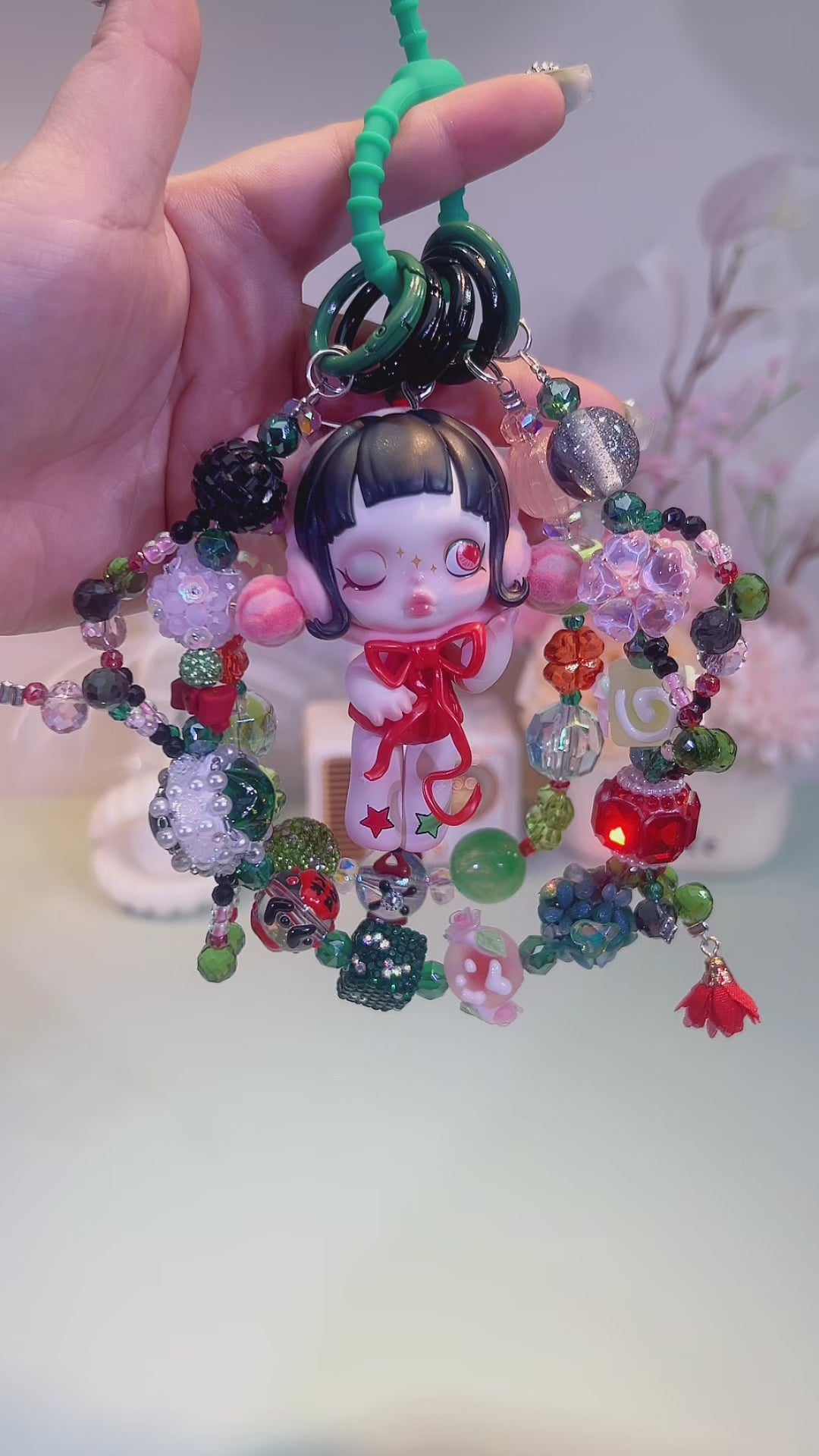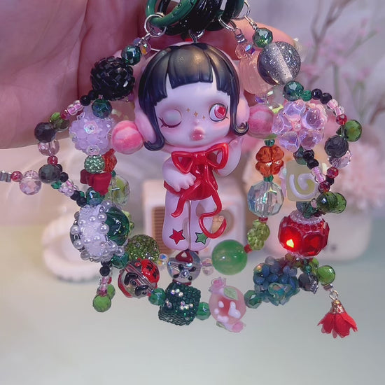 Dive into a world of colorful, playful fashion with Skullpanda Getting Dressed! This cool Skullpanda, rocking a vibrant red outfit with fun star details and fluffy pink accents, is surrounded by a handmade bead chain bursting with colorful beads, sparkling crystals, and cute pendants. Every element blends to create a vibe of energetic style, like a little fashion show on your bag.