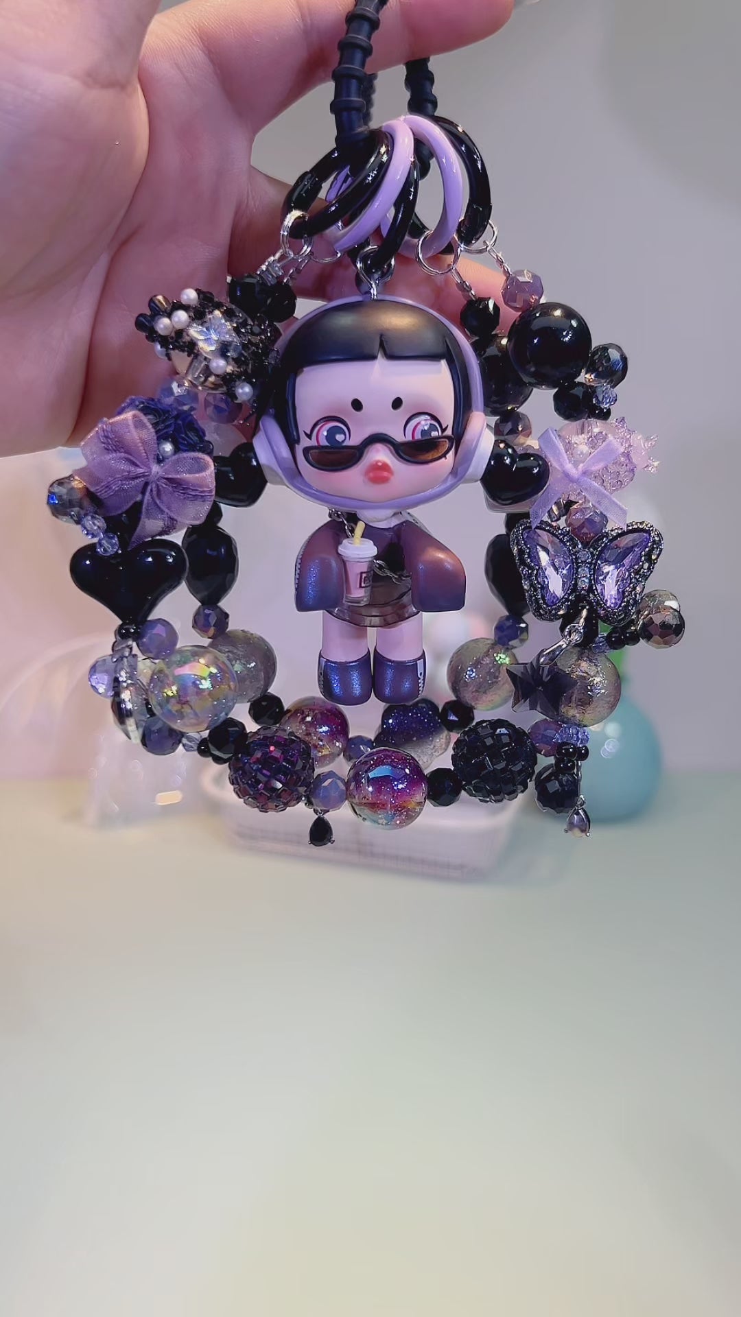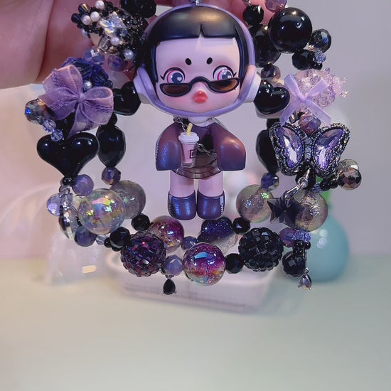 Step into the world of purple - hued chic with Skullpanda Milk Tea Girl! This cool - looking Skullpanda, rocking a stylish outfit and sunglasses, holds a cute milk tea, blending urban fashion with a touch of playfulness. The handmade bead chain is a purple - toned dream—shiny crystals, iridescent beads, and charming pendants (like delicate bows and butterflies) surround her, each detail radiating edgy yet sweet vibes.