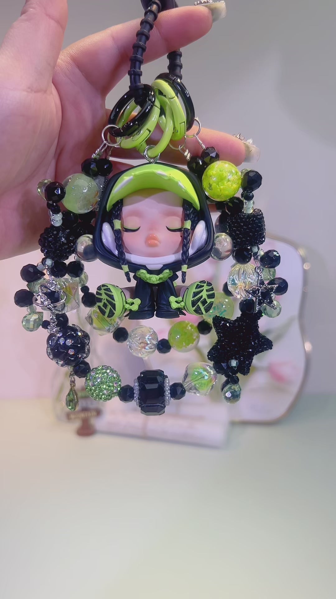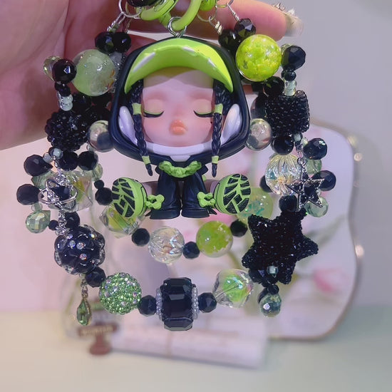 Embark on a neon - cool adventure with Skullpanda The Traveller! This stylish Skullpanda, decked out in a futuristic outfit with neon green accents and a laid - back pose, radiates a vibe of edgy exploration. Surrounded by a handmade bead chain full of shiny black and neon green beads, plus eye - catching pendants, every detail screams bold, travel - ready energy.