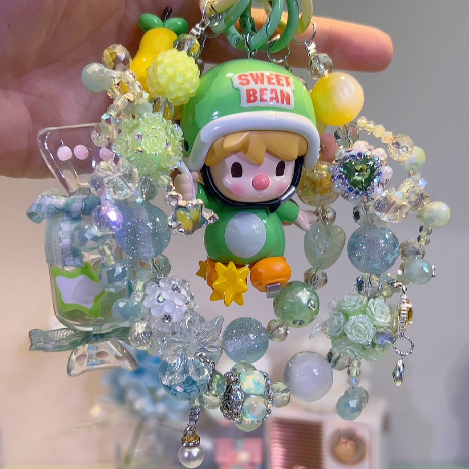 Surrounding Sweetbean is a meticulously hand - crafted bead chain, a harmonious blend of green, yellow, blue, and iridescent tones. Shimmering crystal - like beads mimic the glistening of fresh fruit or the sparkle of a sunny day, while textured beads add depth and a tactile dimension, evoking the feel of smooth fruits or shiny decorations.